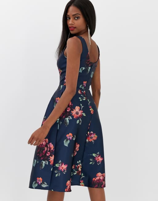 Chi Chi London Blue Floral Print Midi Skater Dress Navy Floral Dress Floral Print Midi Dress Fit N Flare Dress