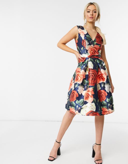 Chi Chi London Midi Dress In Navy Based Rose Print Asos