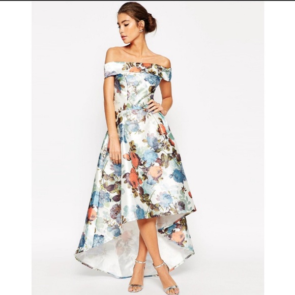 Chi Chi London Store Near Me Chi Chi London Satin Midi Dress In Floral Print Multi Women Chi Chi London High Neck Chi Chi London Digital Floral Print Bardot Dipped Hem Maxi Dress