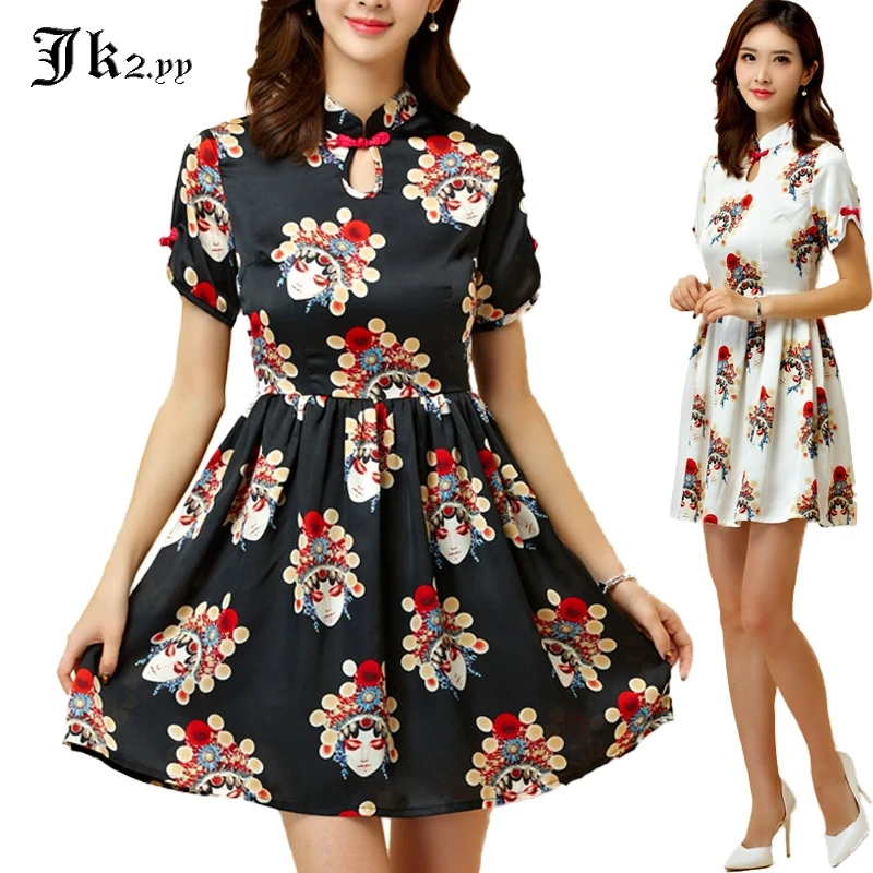 M Xxxl Frauen Kurzarm Print Kleider Sommer Chinesischen Stil Peking Oper Stehkragen Kurzarm Satin Plissee Kleid 9951 Pleated Dress Print Dressdress Style Aliexpress