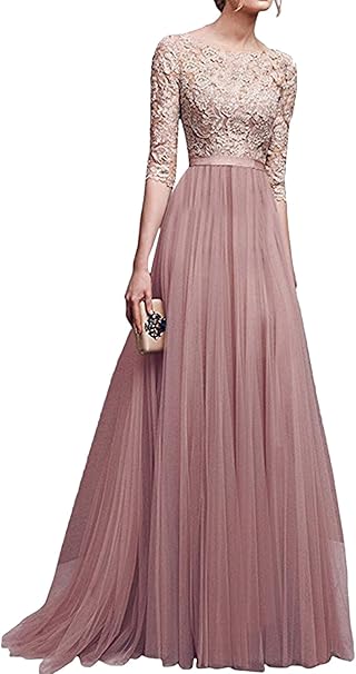 Omuutr Damen Kleid 3 4 Arm Spitzen Chiffon Langes Party Ballkleid Abendkleid Cocktailkleid Faltenrock Festliche Kleider Brautjungfer Hochzeit Amazon De Bekleidung