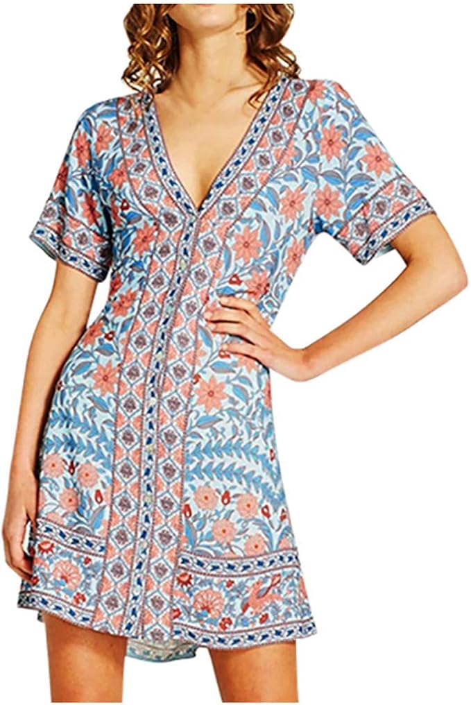 Hingpy Damen V Ausschnitt Blumendruck Knopf Kurzarmeliges Urlaub Bohmisches Kleid Mit Spitze Dekoration Um Die Perfekte Figur Zu Zeigen Amazon De Bekleidung