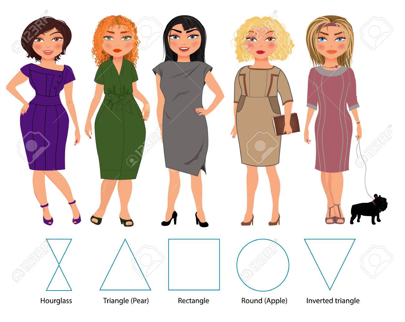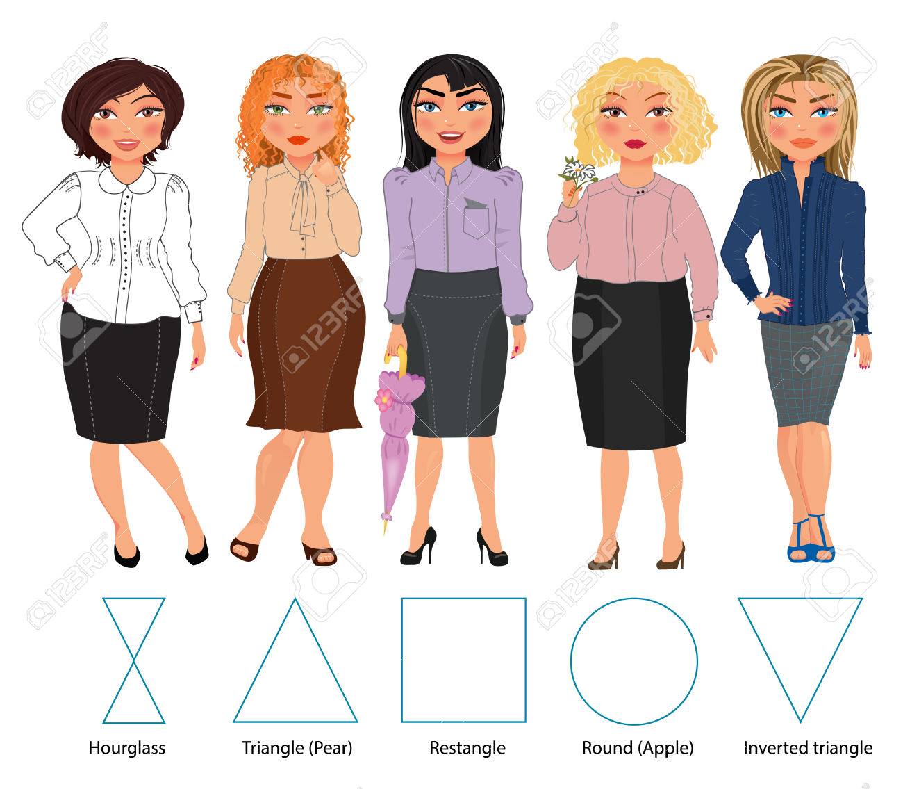 Funf Typen Von Frau Figuren In Bussiness Kleider Sanduhr Dreieck Restangle Rund Und Umgekehrtes Dreieck Vektor Hand Gezeichnete Illustration Lizenzfrei Nutzbare Vektorgrafiken Clip Arts Illustrationen Image 43686419