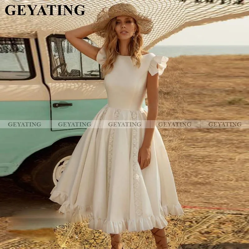 Vintage Elfenbein Kurze Hochzeit Kleid Tee Lange Ruschen Spitze Satin Zivil Brautkleider Plus Grosse Sexy Strand Braut Kleider A Line Brautkleider Aliexpress