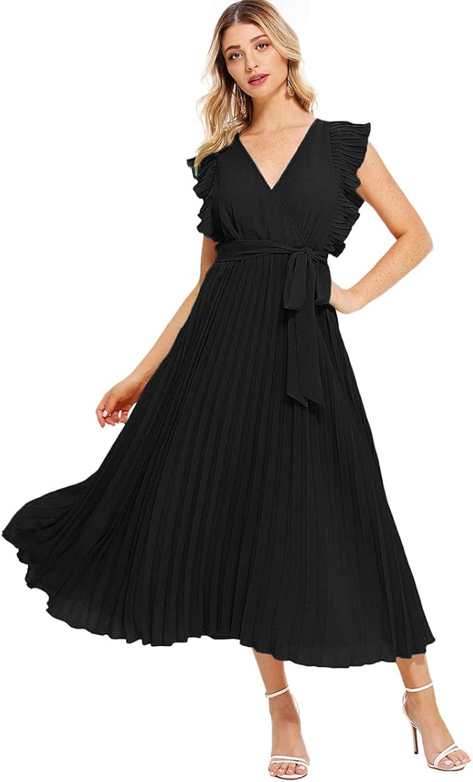 Didk Damen Kleid Lang Plissee V Ausschnitt Armellos Fur Hochzeit Gast Mit Elegantem Gurtel Gr X Small Schwarz Amazon De Bekleidung