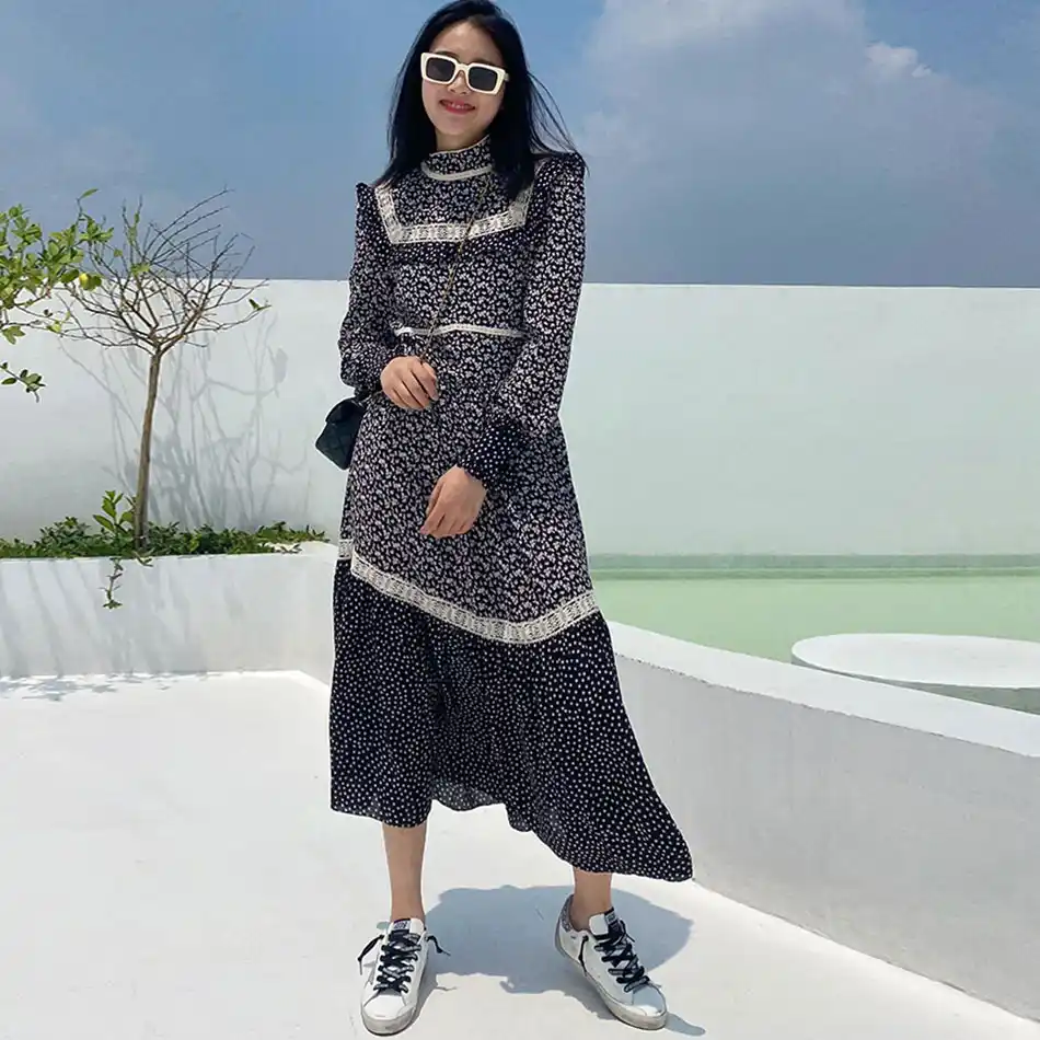 2020 Herbst Frauen Floral Print Kleid Mode Stehen Kragen Langarm Spitze Patchwork A Line Langes Kleid Runway Club Party Kleid Kleider Aliexpress