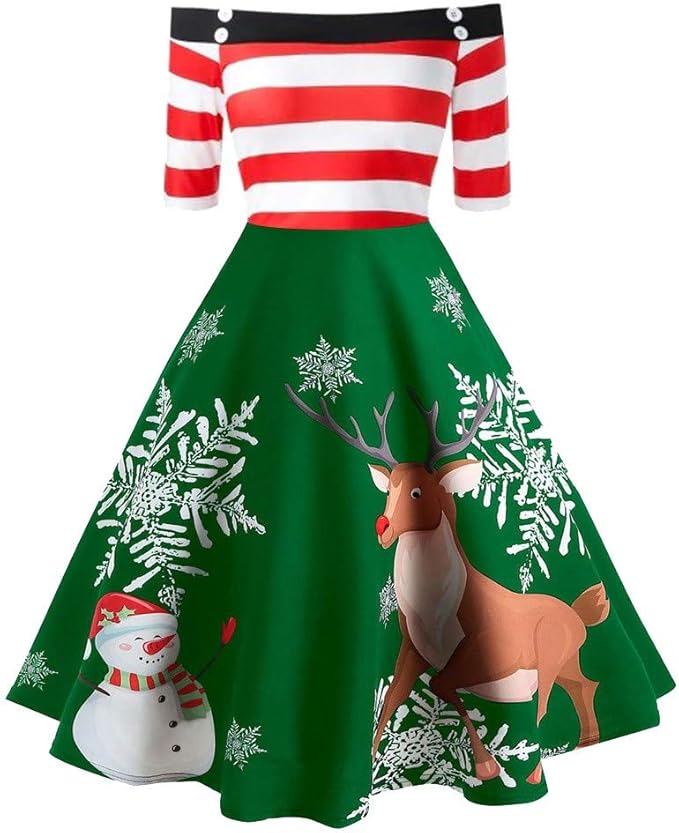 Bolanq Damen Weihnachten Kleider Langarm Weihnachtskleid Vintage Hepburn Cocktailkleid Weihnachten Druck Partykleid A Linie Swing Kleid Dress Amazon De Bekleidung