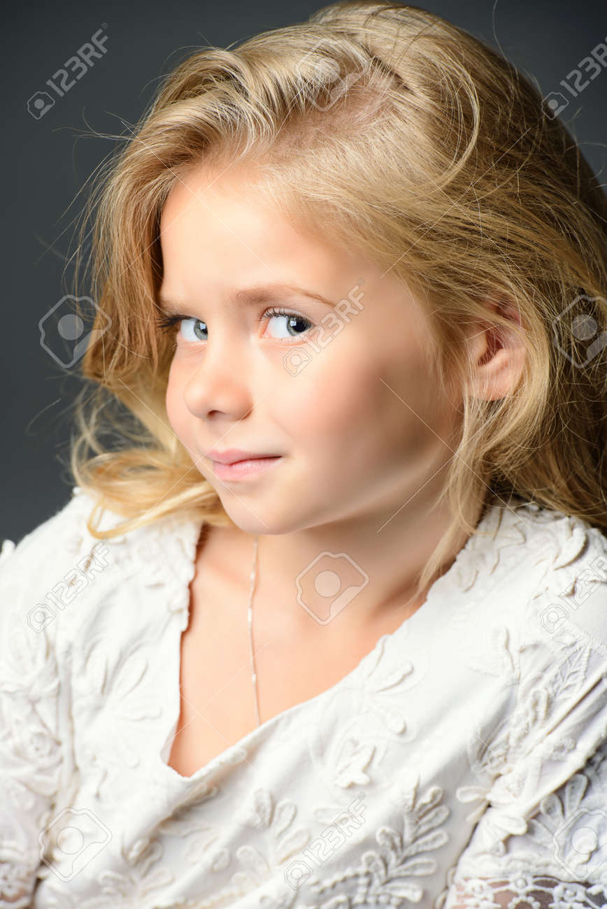 Close Up Portrat Von Einem Hubschen Kleinen Madchen Mit Schonen Blonden Haaren Tragen Weisses Kleid Studio Gedreht Kinder Schonheit Mode Lizenzfreie Fotos Bilder Und Stock Fotografie Image 45660863